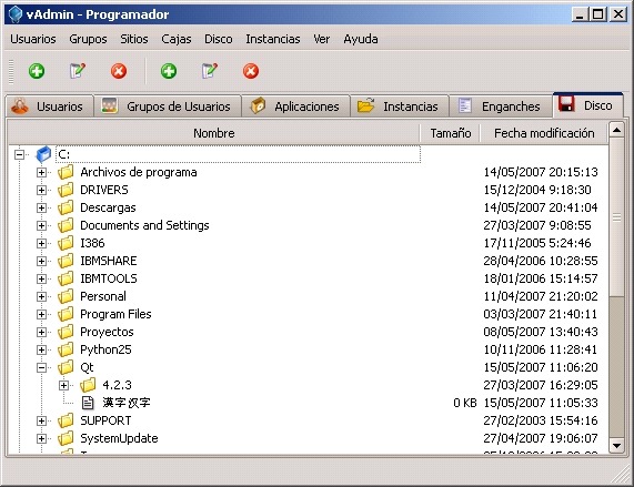 Dentro de las funcionalidades de Velneo vAdmin, una de las más importantes es declarar los directorios donde se instanciarán las aplicaciones, pero siempre en servidor remoto. Gracias a la implementación del servidor de disco en Velneo vServer y el protocolo VATP se permite, de una forma transparente, gestionar las unidades y directorios donde se encuentra instalado Velneo vServer.Como es habitual en Velneo, la interoperatividad entre las distintas plataformas está garantizada, con lo que podrás administrar los ficheros de Velneo vServer en un sistema operativo Solaris sin entorno gráfico desde Velneo vAdmin con Windows Vista.